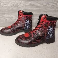 Auffällige, schwarz-rote Schnürstiefeletten mit Spinnennetz-Print und ikonischem „Skelly Jack“-Motiv – perfekt für alle, die einen markanten, individuellen Look lieben. Gefertigt aus strapazierfähigem Kunstleder mit weichem Innenfutter und robuster Profilsohle für optimalen Tragekomfort.